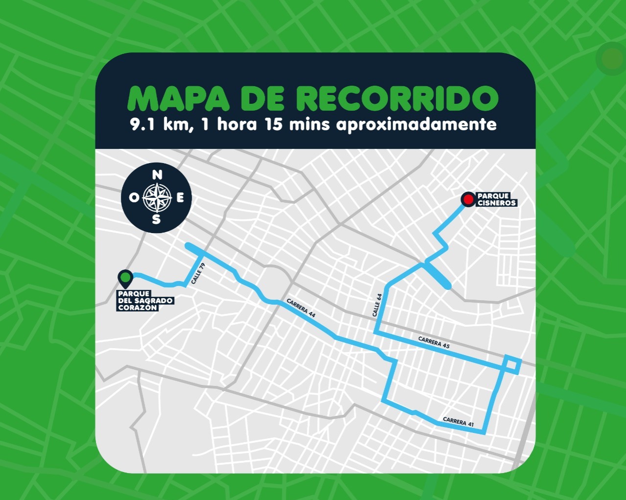 Se iniciará en la Calle 80B con Carrera 42F, Parque Sagrado Corazón, luego se dirigirán al este sobre la Carrera 42F hasta la Calle 79, llegarán al norte hasta llegar a la Carrera 44 con Calle 79B Parque Eugenio Macías, siguiendo por la Carrera 44 hasta la Calle 61. donde girarán a la derecha para llegar a la Carrera 41, Parque Boulevard del Recreo, continuando hasta la Calle 50, luego giran a la izquierda sobre la Calle 50 y para dirigirse hacia Plaza de la Paz. Continuarán hacia el occidente por la Carrera 45 hasta la Calle 64 en giran hacia norte hasta encontrarse con el Parque de las Américas y luego el Parque de los Fundadores, en donde se recorre el perímetro de este por la Carrera 54. Posteriormente busca la Calle 64 donde se dirigen al norte hasta llegar a la Carrera 60, en este punto giran a la izquierda y se dirigen a la Calle 66 donde proceden a girar a la derecha hasta llegar a la carrera 65, Parque Cisneros donde se finalizará el recorrido.