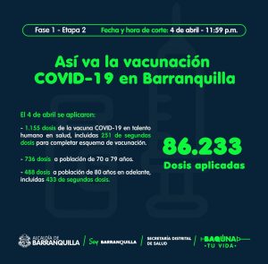 Con la llegada de otras 4.680 dosis de la vacuna COVID-19 y la disponibilidad de cinco grandes escenarios y más de 50 puntos que atienden en jornada continua de 8:00 a.m. a 4:00 p.m., la vacunación en Barranquilla avanza de manera satisfactoria.