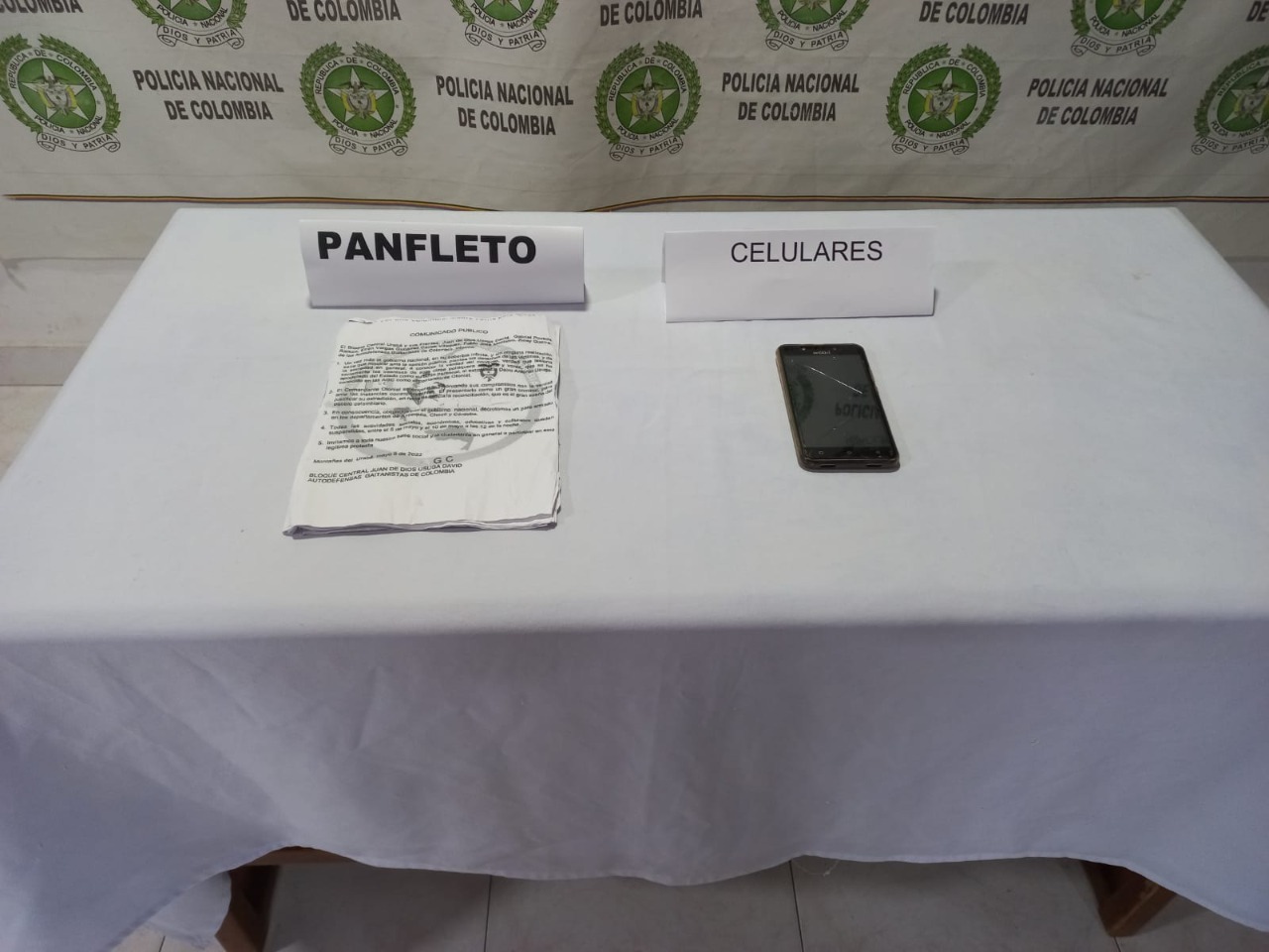 Al momento de la captura al individuo le fueron hallados panfletos intimidatorios y con importante material relacionado con su presunto vínculo con el grupo armado organizado ‘Clan del Golfo’.