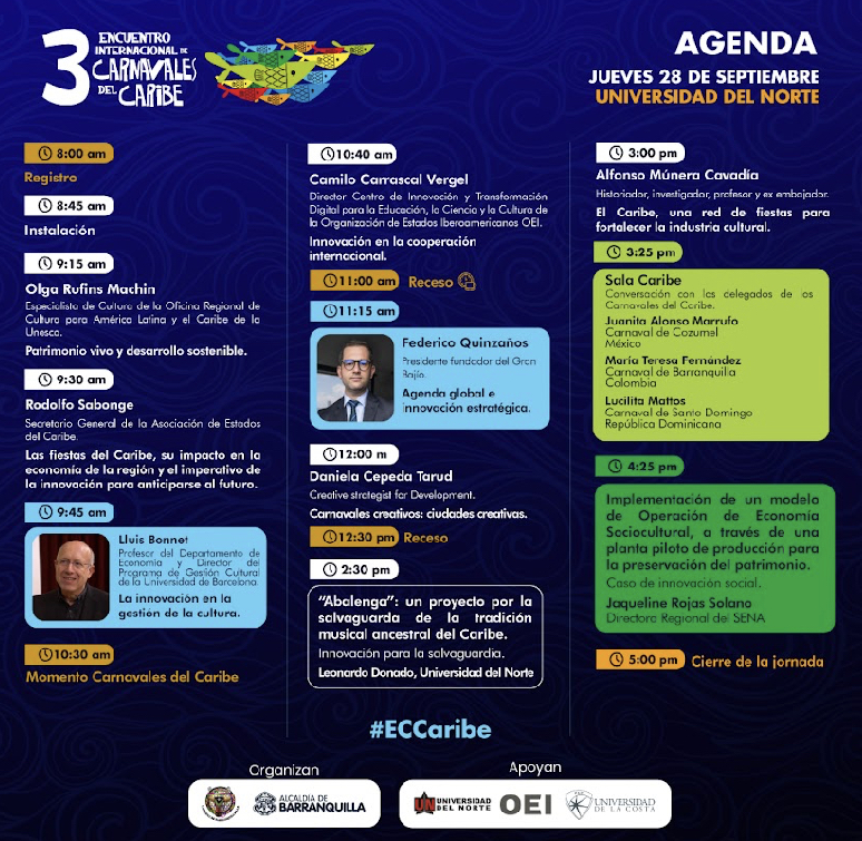 Carnaval de Barranquilla con el apoyo de la Organización de Estados Iberoamericanos, la Universidad del Norte y la Corporación Universitaria de la Costa -CUC- realizan el tercer Encuentro Internacional de Carnavales del Caribe el 28 y 29 septiembre.