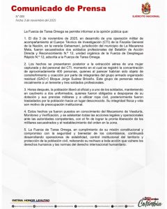 El Ministro de Defensa, Pedro Arnulfo Sánchez, rechazó de manera contundente el acto criminal a través de su cuenta en X, donde exigió la liberación inmediata de los uniformados. “Rechazo de manera categórica el vil secuestro de nuestros dos soldados profesionales del Ejército Nacional”, manifestó el funcionario.