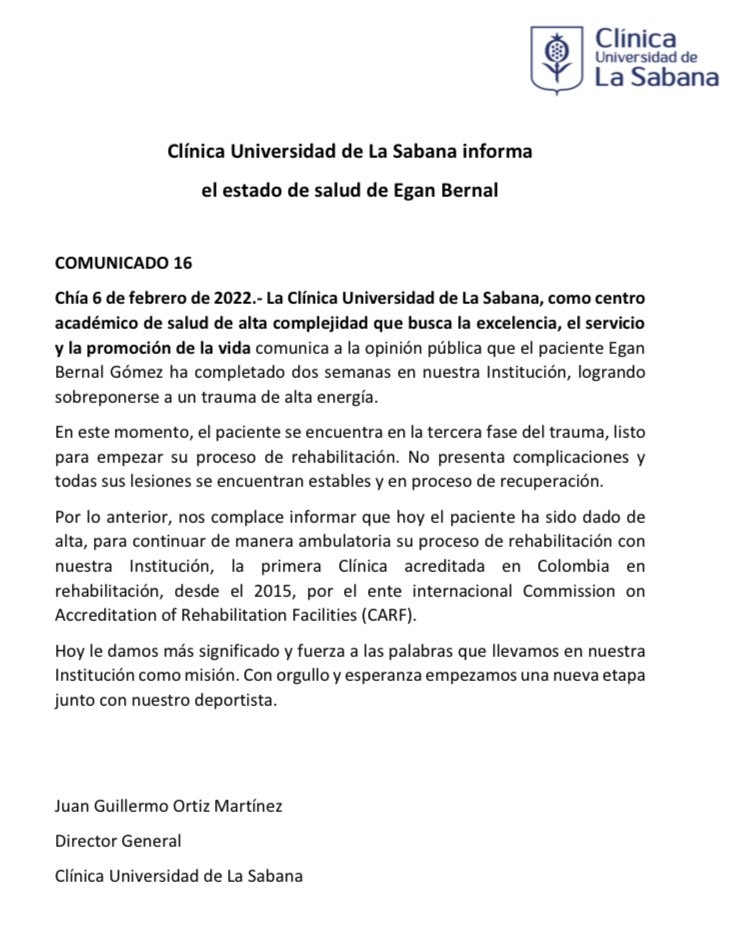 Egan Bernal fue dado de Alta Después de dos semanas en la Clínica Universidad de la Sabana, en Bogotá. Así lo dio a conocer el centro médico.