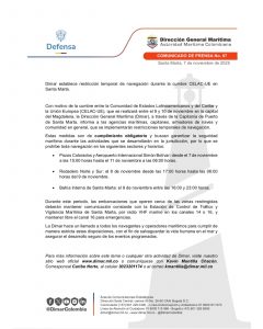 Con motivo de la Cumbre entre la Comunidad de Estados Latinoamericanos y del Caribe (CELAC) y la Unión Europea (UE), que se llevará a cabo entre el 9 y el 10 de noviembre en la capital del Magdalena, la Dirección General Marítima (Dimar), a través de la Capitanía de Puerto de Santa Marta, informa a las agencias marítimas, capitanes, armadores de naves y comunidad en general sobre la implementación de restricciones temporales de navegación.