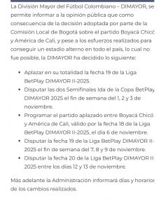 Según la Dimayor, pese a las gestiones realizadas para encontrar un estadio alterno, no se logró definir una sede adecuada, por lo que el compromiso fue reprogramado para el 6 de noviembre.