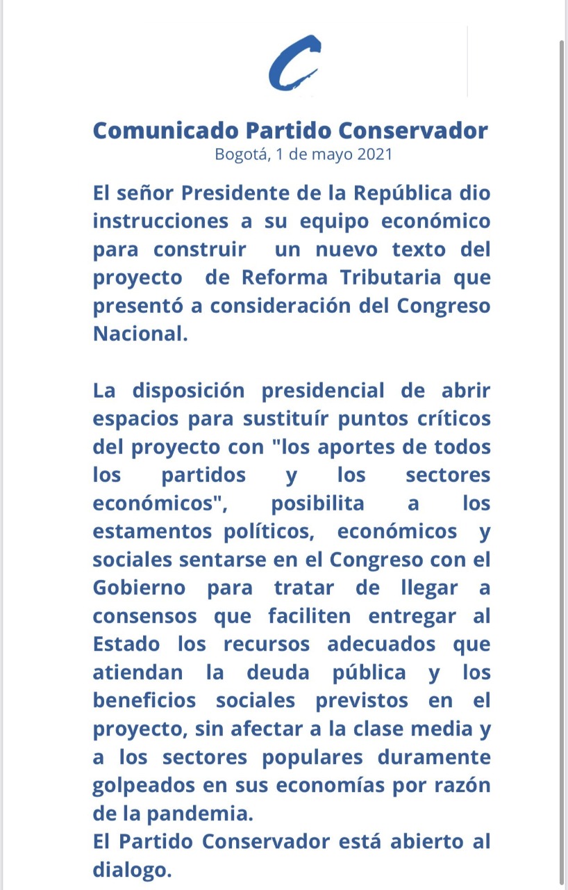 A través de un comunicado el Partido Conservador Colombiano, dijo estar abierto al diálogo con el gobierno del presidente Iván Duque para construir un nuevo texto de la Reforma Tributaria que incluya aportes de los partidos políticos, sectores económicos y sociales.