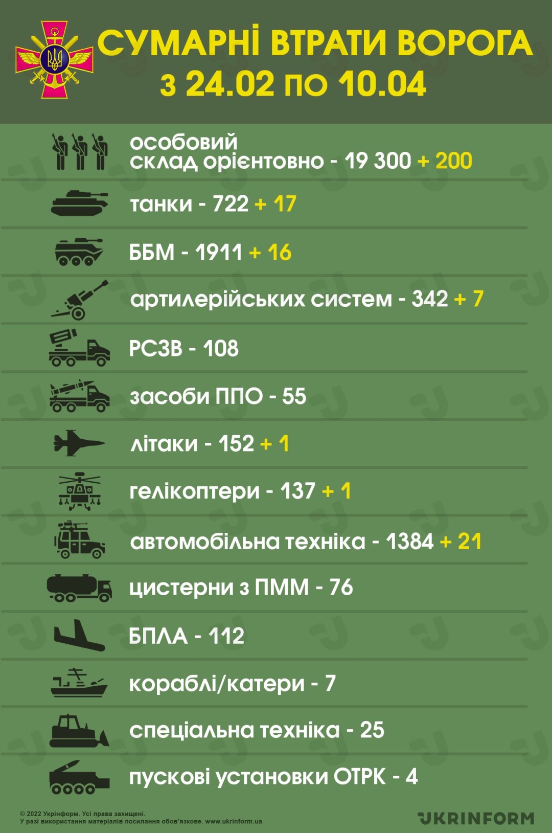 Además, el enemigo perdió 722 tanques, 1.911 vehículos blindados de combate, 342 sistemas de artillería, 108 lanzacohetes múltiples, 55 unidades de defensa aérea, 152 aviones, 136 helicópteros, 1.363 vehículos de motor, 7 buques/lanchas, 76 camiones cisterna de combustible, 112 UAV tácticos y operativos, 25 unidades de equipo especial y 4 sistemas de lanzamiento de misiles móviles.