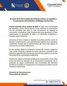 Este jueves 30 de octubre el rector Leyton Barrios de la Universidad del Atlántico emitió un comunicado en el que rechazó “actos violentos o vandálicos” que afectan la seguridad de personas, el patrimonio público y el normal desarrollo académico de la institución. Al mismo tiempo, hizo un llamado al diálogo y aseguró que la rectoría respeta la autonomía universitaria.