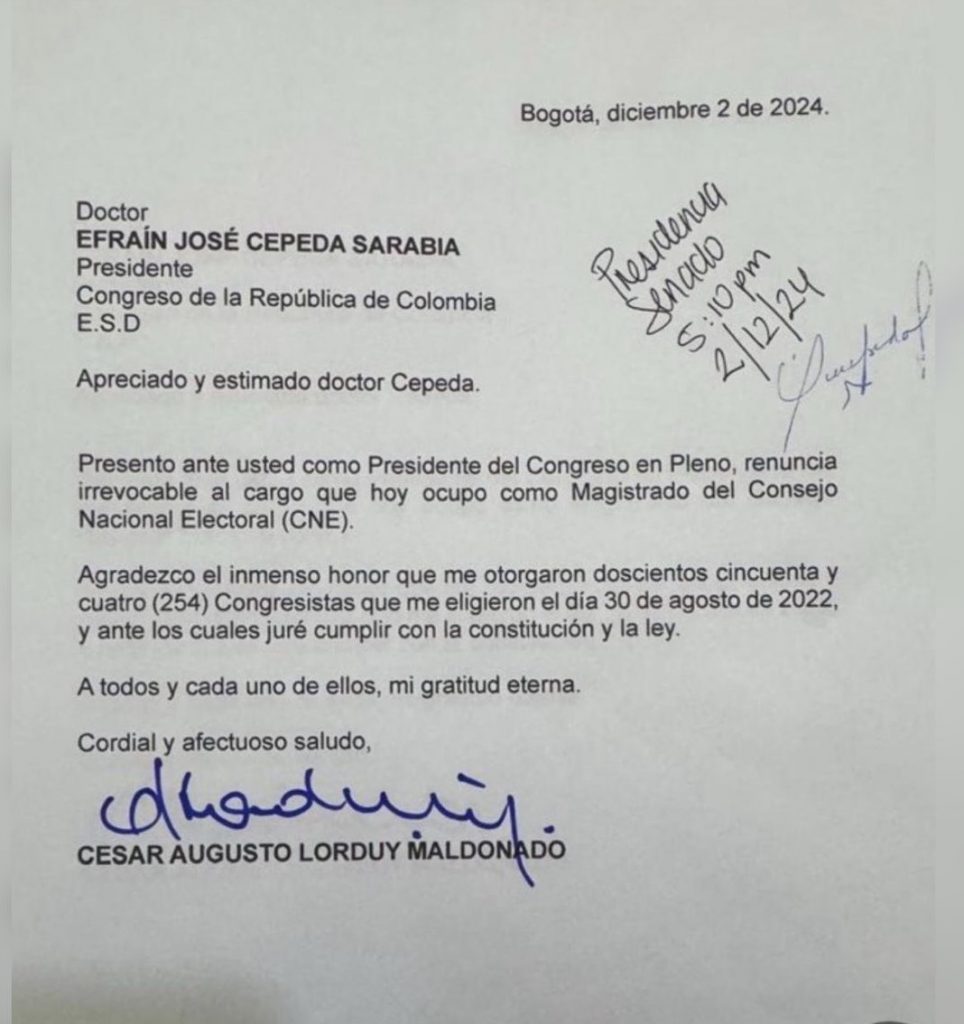 Su dimisión fue presentada ante el senador conservador Efraín Cepeda, presidente del Congreso de la República. “Presento ante usted como presidente del Congreso en pleno renuncia irrevocable al cargo que hoy ocupo como magistrado del Consejo Nacional Electoral”, se lee en la misiva. La carta de renuncia se produce en medio de las investigaciones que el tribunal electoral adelantan contra la campaña presidencial del 2022 de Gustavo Petro por presunta financiación irregular.