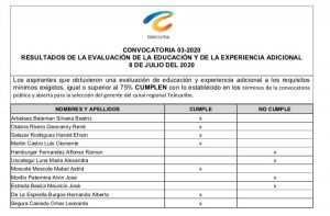 De acuerdo a la evaluación de educación y experiencia adicional a los requisitos mínimos exigidos, 7 de los 11 aspirantes para la gerencia del Canal Regional Telecaribe, tuvieron un resultado igual o superior al 75 %, cumpliendo así con lo establecido en los términos de la convocatoria pública y abierta.