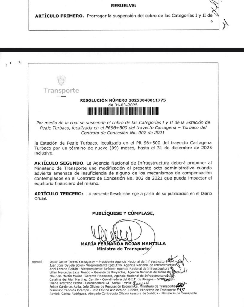 El Ministerio de Transporte expidió la Resolución 20253040011775 con la que prorroga por nueve meses la suspensión del cobro del peaje de Turbaco, ubicado en el trayecto a Cartagena, para los vehículos categorías I y II.